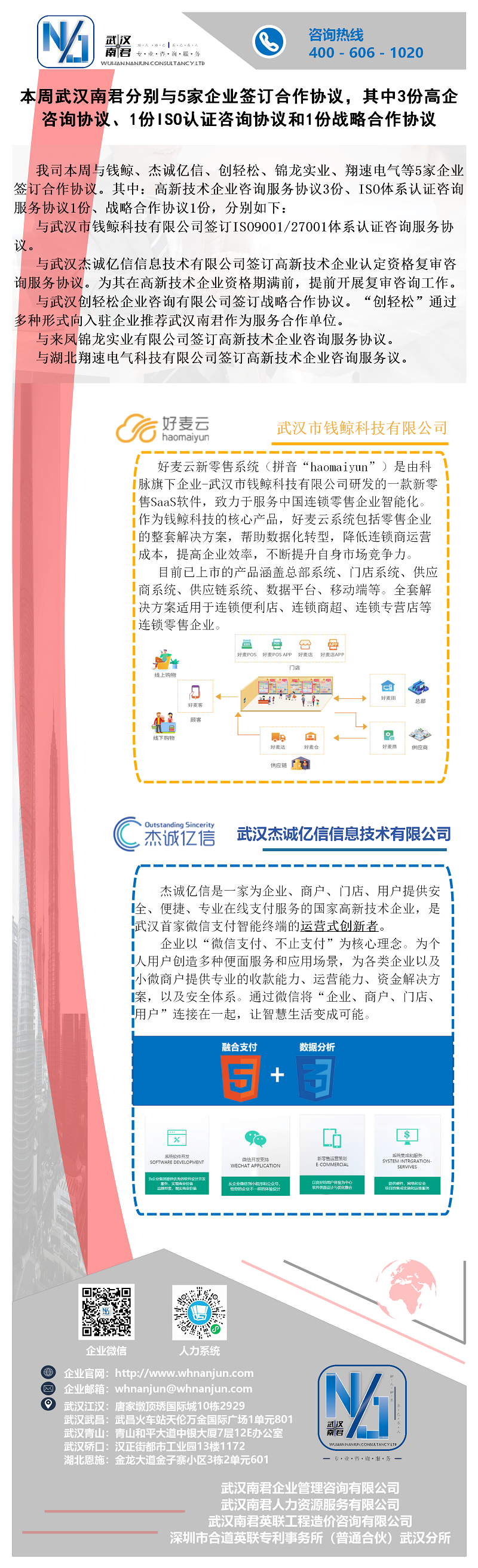 本周武汉南君分别与5家企业签订合作协议,其中3份高企咨询协议、1份ISO认证咨询协议和1份战略合作协议