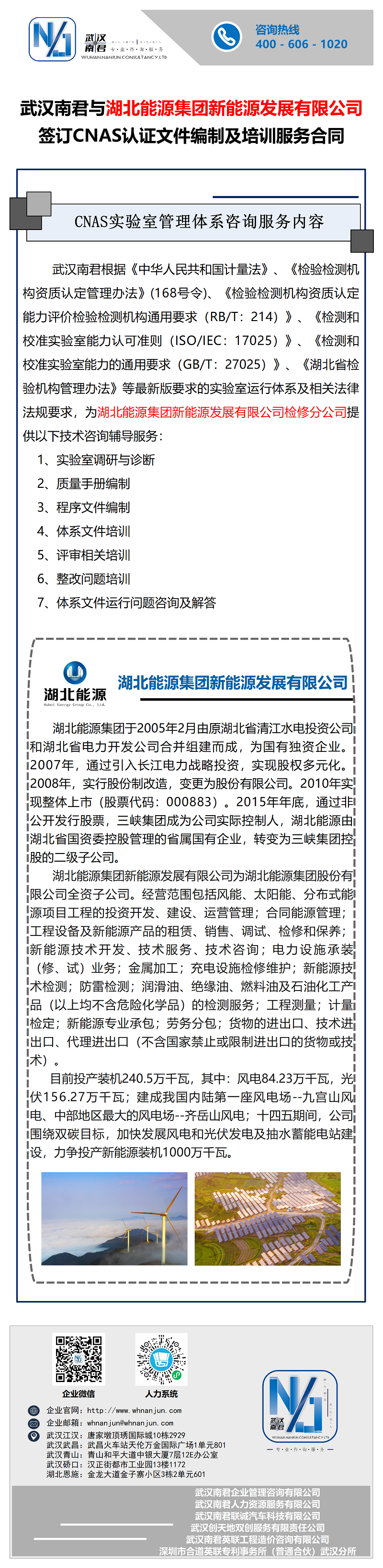 武汉南君与湖北能源集团新能源发展有限公司签订CNAS认证文件编制及培训服务合同